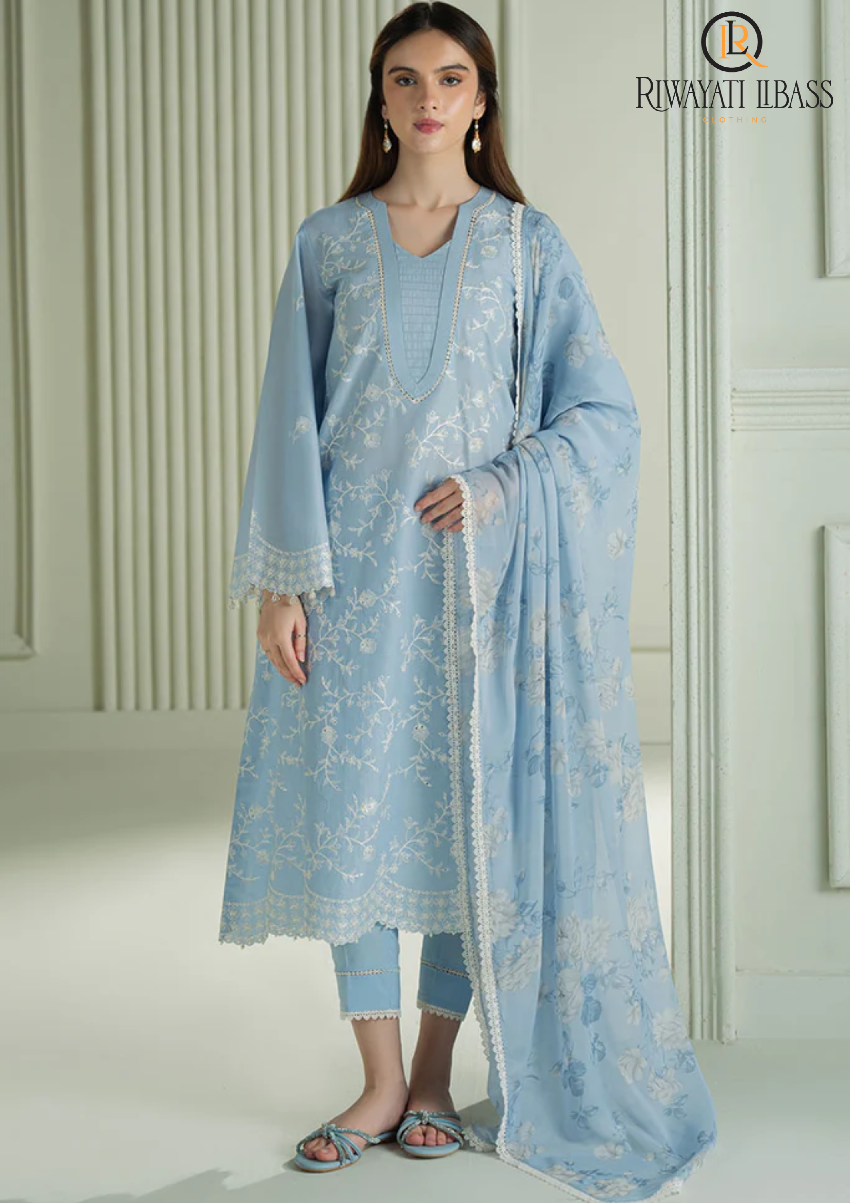 Summer Unstitched 3PCs Embroidered Lawn Dress With Digital Printed Cotton Net Dupatta RL-296