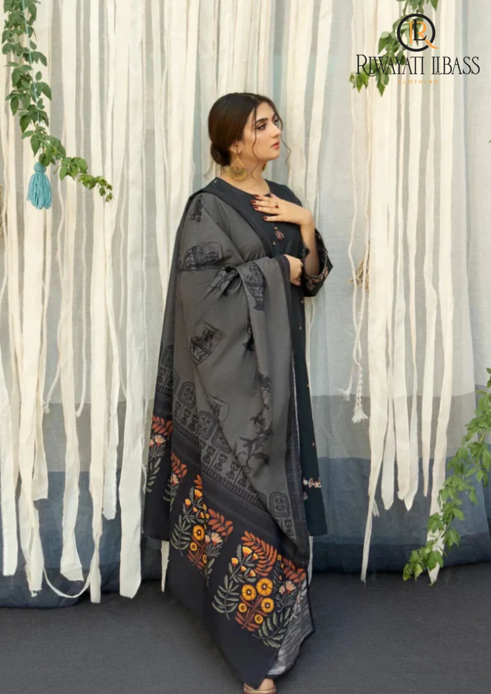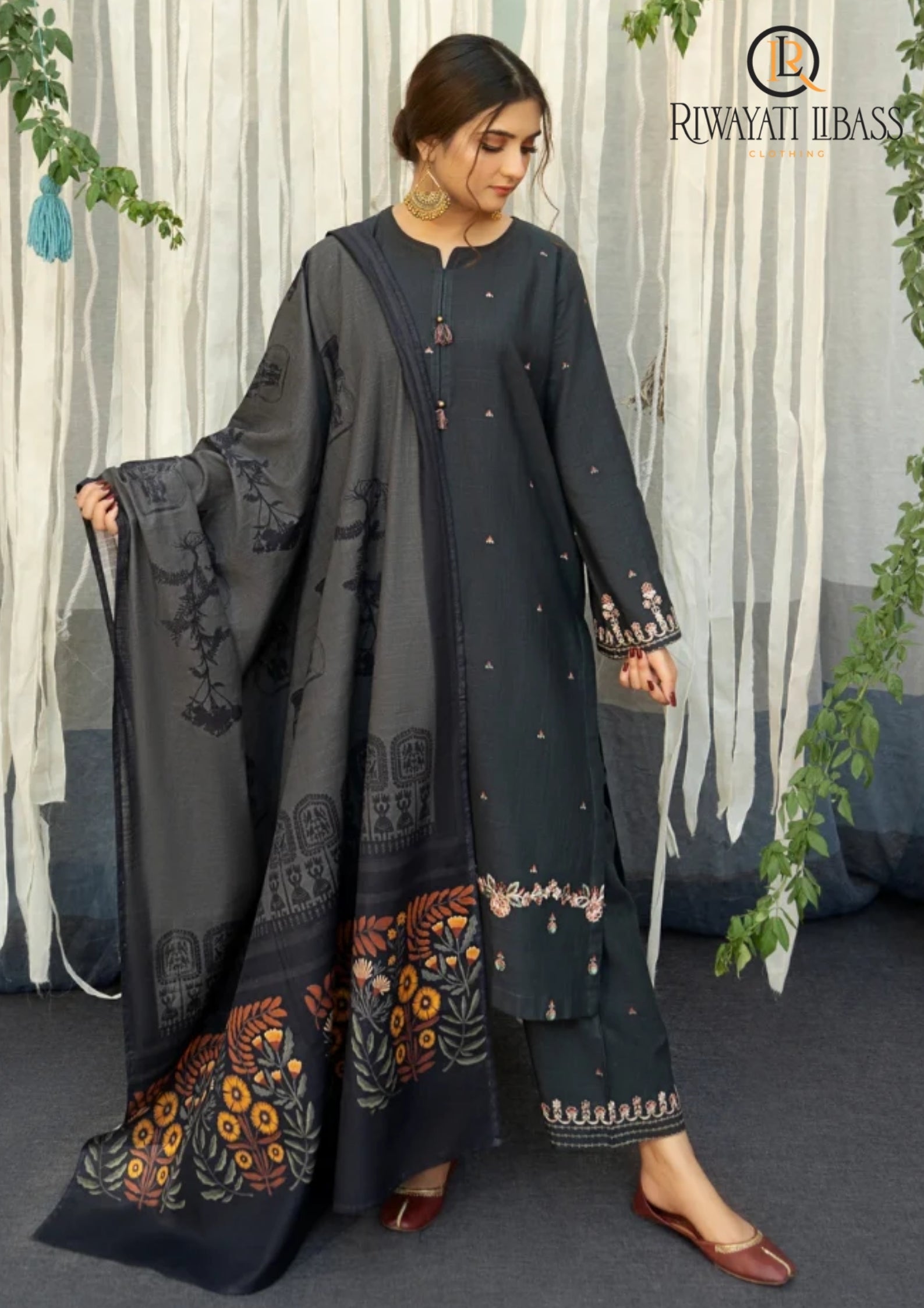 Winter Unstitched 3PCs Embroidered Dhanak Dress With Digital Printed Dhanak Shawl RL-650