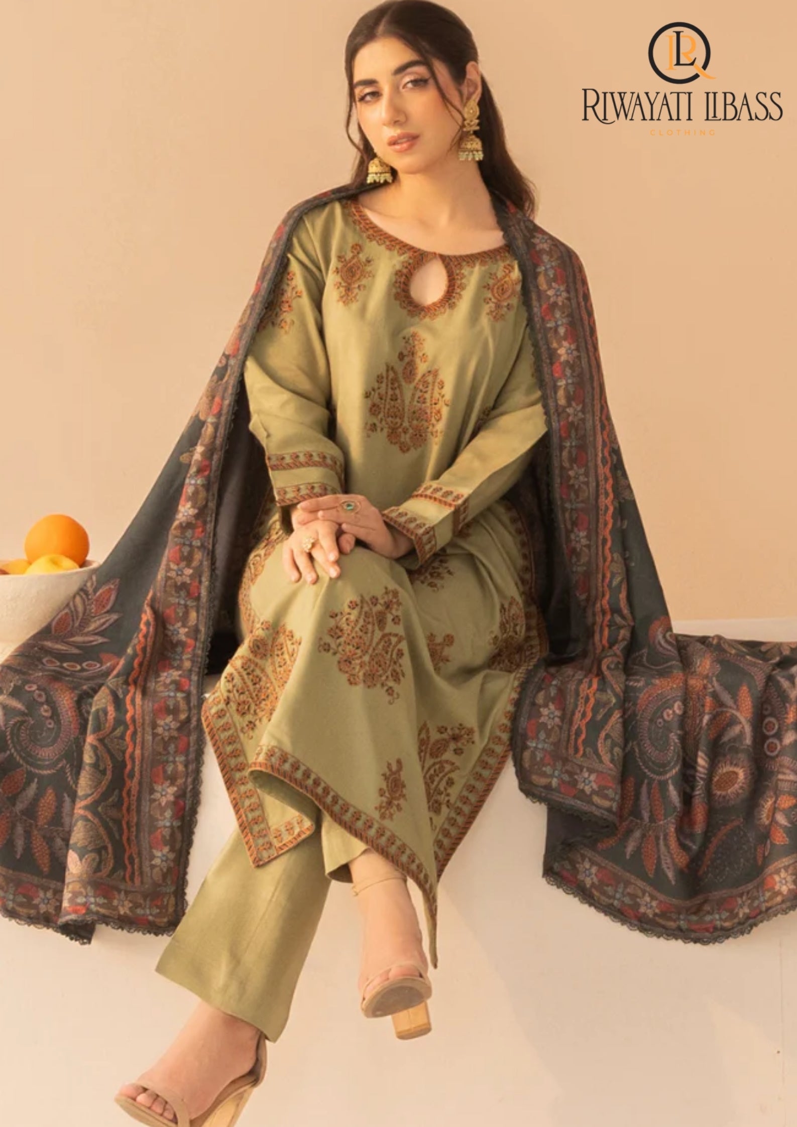 Winter Unstitched 3PCs Embroidered Dhanak Dress With Digital Printed Karandi Shawl RL-636
